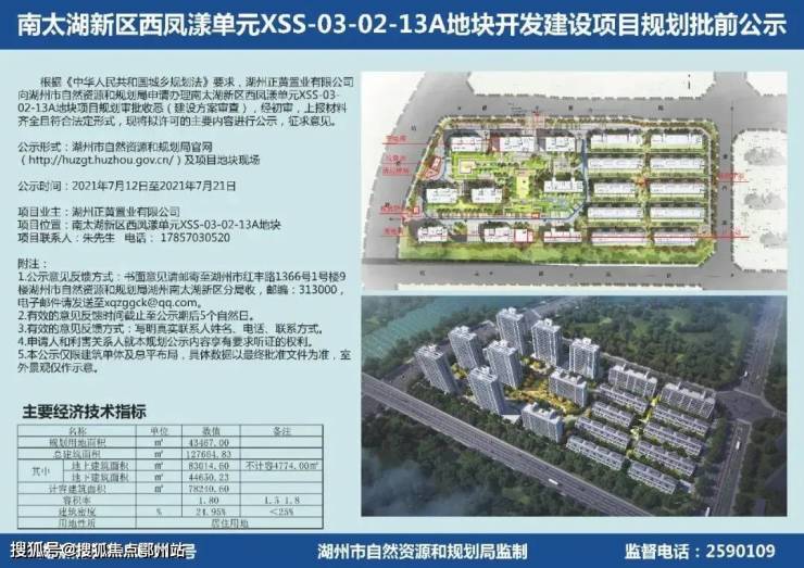7月12日,湖州市自然资源和规划局发布“南太湖新区西凤漾单元XSS-03-02-13A地块开发建设项目规划批前公示”。