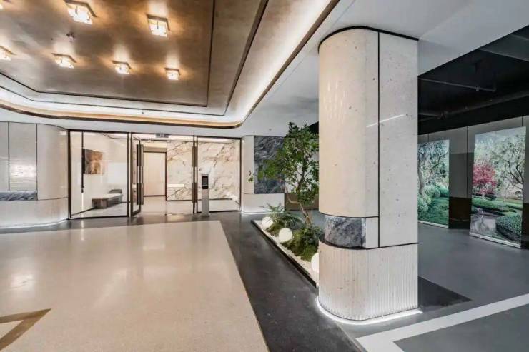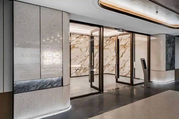 入户大厅的部分外墙上也采用香槟金与部分灰色石材,门头雨棚采用香槟金色弧形装饰,搭配大玻璃面,尊崇感呼之欲出。