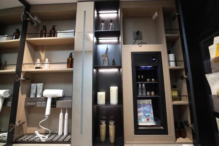 整面墙的镜柜,内部配备了 美妆冰箱+门板收纳架+轨道式置物架 ,储物空间打造的非常充足。