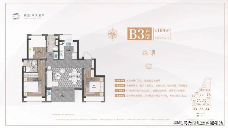 1、建面约100㎡三房两厅两卫,市场主流户型。客餐横厅设计配多功能阳台,优势在于更大采光面和更好通风效果,把过道纳入到客厅和餐厅的空间中来,使整体空间得到更好的利用。