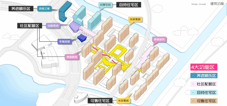 据悉社区由自持住宅、可售住宅、社区配套三大功能组合而成,北区为公区自持配套区,中区为住宅社区,南区为住宅社区及配套。