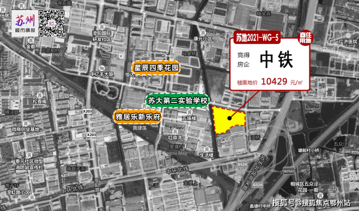 澄澜云庭即苏地2021-WG-5号地块,该地块是在今年年初被中铁以总价14.17亿元拿下,楼面地价为10429元/㎡,溢价率7.51%。