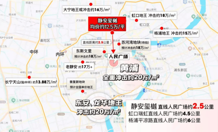 静安玺樾在上海中轴线之上,直线距离人民广场约2.5公里,与静安寺相距人广距离类似。比虹口、杨浦等区域更靠近传统市中心,在同价位段新房中位置更出众!