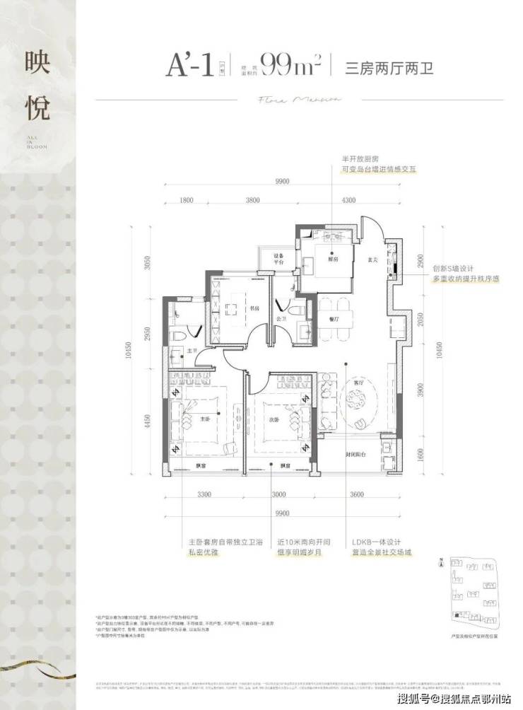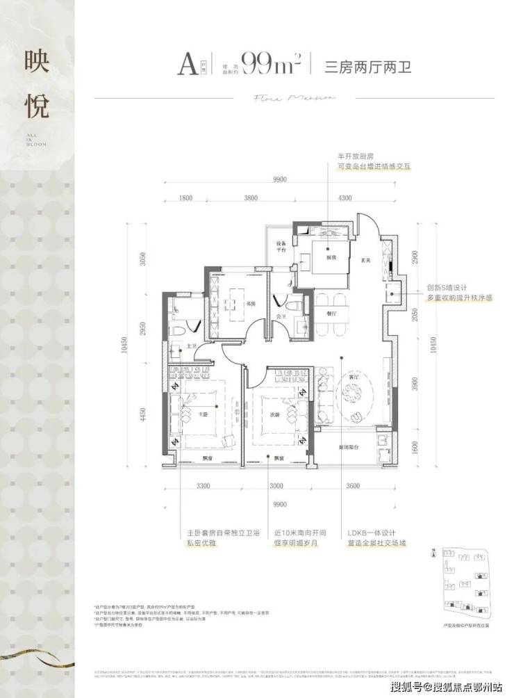 该边套户型,不仅有 270度的采光视野,主/次/客卧三大开间并立朝南,“含阳光量”十足。