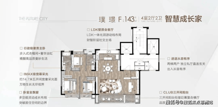 璞 璟 | F户型 | 建筑面积约143㎡ | 四室两厅两卫