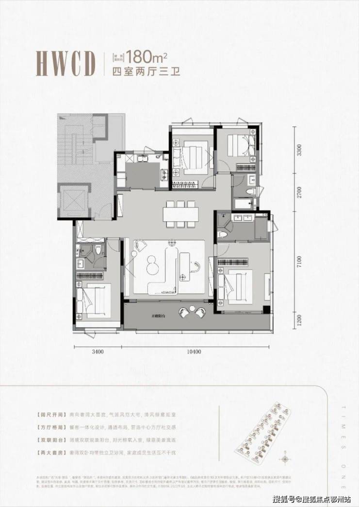 得益于 一梯两户设计,以及洋房的高得房率 ,元垄·望品的建面约180㎡户型,四房两厅三卫,不仅实现“双套房”,户型尺度上也极为阔气。