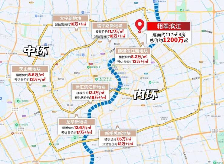 中心城区的土拍价格直线上升,虹口临平路地块的拍出楼板价约11.7万/㎡、徐汇滨江两幅地块楼板价约12.6-13.1万/㎡...