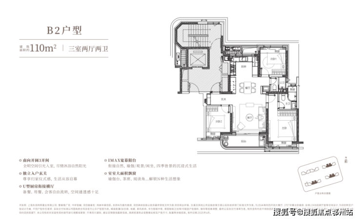 建面约 110㎡ 边套( B1户型) , 1 个 宽面阳台、 5 个 飘窗 , 整体南向面宽做到了约 12.3米,大横厅面宽约5.4米,带来超大空间体验和充足通风采光。更为难得的是,该户型标配了全屋飘窗,主卧更是拥有270°转角飘窗,拓宽室内景观视野的同时,增加了实际空间使用率,加上三玻两腔系统窗隔音,在欣赏窗外景色的同时,也不会被噪音打扰。建面约110㎡中间套 ( B2户型) ,也同样做到了南北通透,三开间朝南,洄游动线,布局合理,无论是空间尺度还是通风采光, 与 边套 享受一样的品质感 !