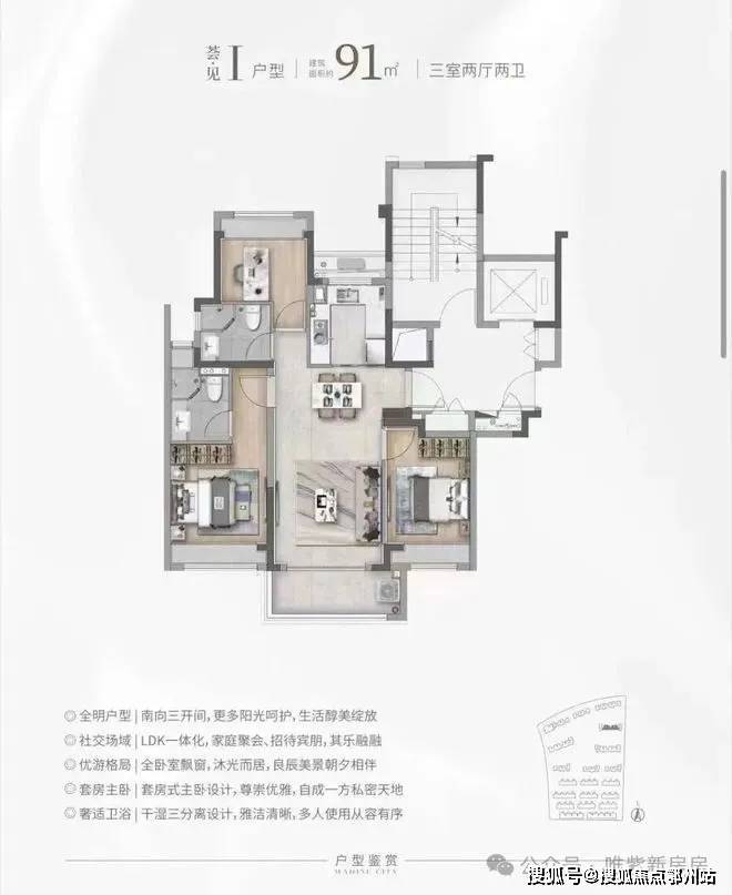 建面约101㎡精装3房,均价4.53万/㎡,总价400万级。采用霍尼韦尔新风、AO史密斯地暖 + 空调、西门子厨电(含洗碗机),全屋飘窗 + 无连廊设计,得房率超80%,每一寸空间都得到极致利用。