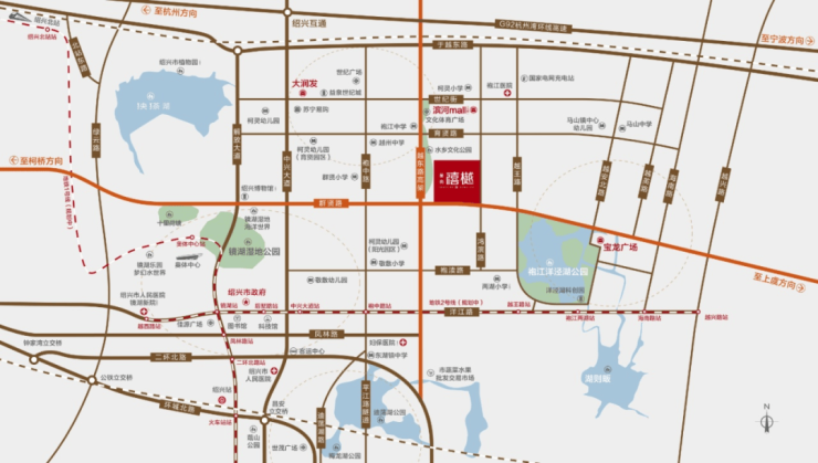 傲踞越东快速路与群贤路“十字中轴”上, 群贤路 东西贯通上虞、镜湖、柯桥三区, 越东快速路 畅达主城与绍兴高速口,一纵一横,执掌城市脉络。
