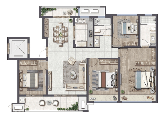 建面约120㎡四叶草户型, 餐客厅一体化+约7米双联阳台 ,空间通透灵动,三代同堂相伴而居,互不干扰。