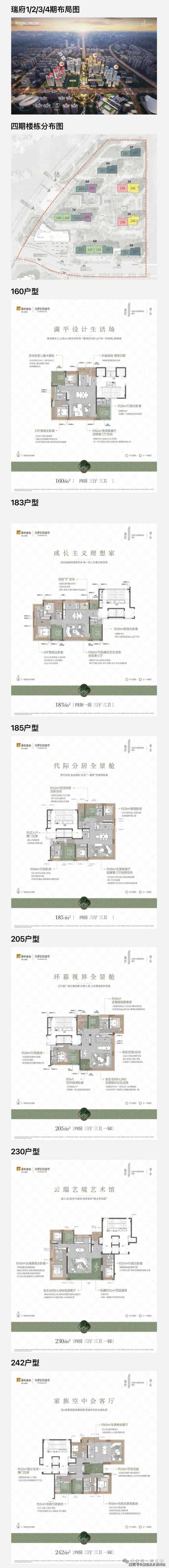 共有6个户型,分别为: 建面约160-183-185-205-230-242㎡。