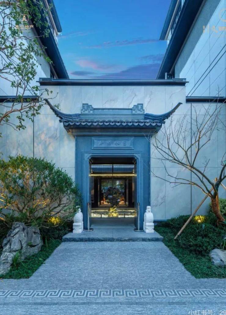 三重屋檐,代表天地人融合的东方宫殿最高等级,上檐、外檐、下檐三重结构,现代立面,以铝板、格栅、石材、瓦墙型材、玻璃等现代型材,彰显传世之宅的独特气度。