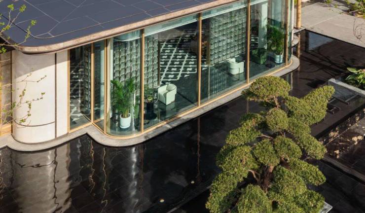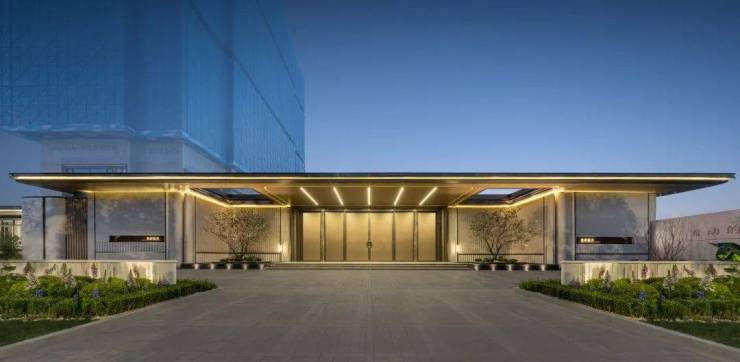 立面方面, 汲取现代轻奢法式的白金美学灵感,叠加大面玻璃,打造出光影灵动的对称式金色画框立面。