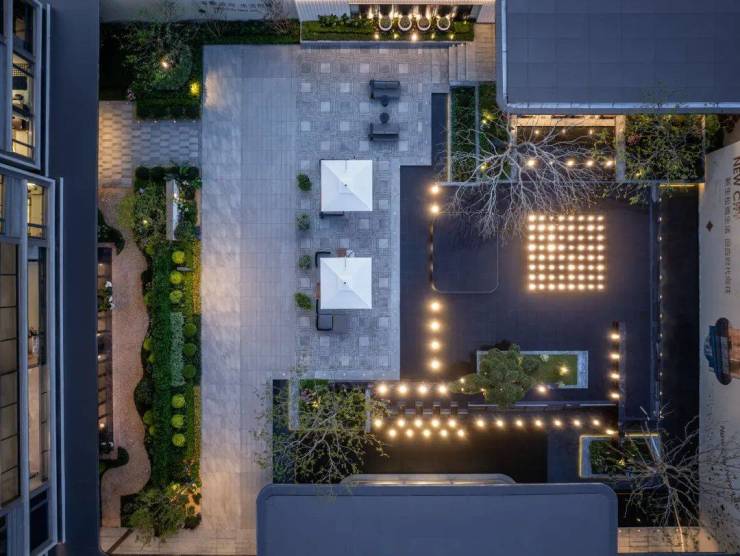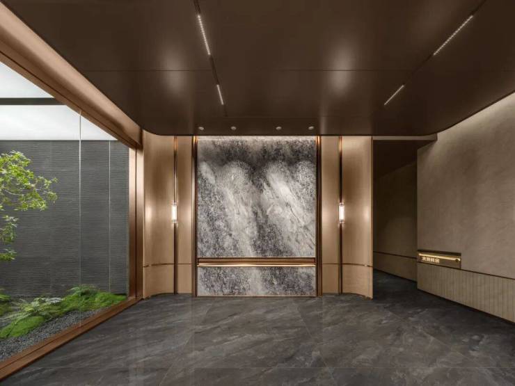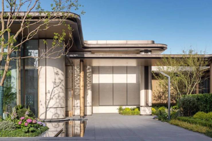 入口两侧油橄榄树姿态优雅,自带松弛感;归家序厅两侧有种植桂花树,隐喻"蟾宫折桂"的祝福;地面铺装芝麻黑花岗岩与福鼎黑花岗岩,不仅沉稳大气还有活泼灵动……