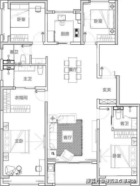 E户型 建面约168㎡4房边套