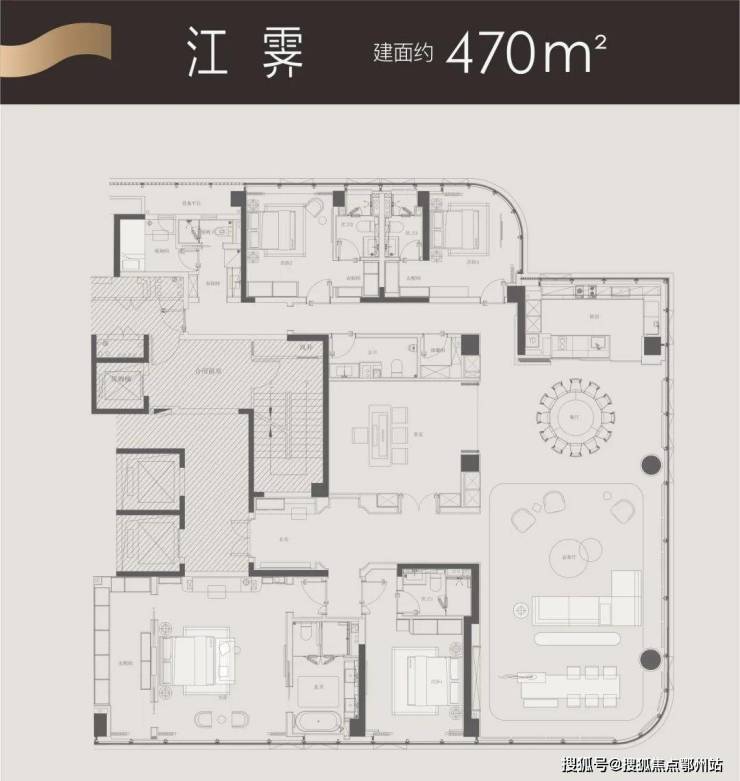 470㎡户型也是采用LDK客餐厨空间一体设计,拥有270°大弧形型玻璃幕墙环幕江景。本次户型最大的升级在于,在原有的基础上将十字中轴的一侧过道融合进X空间,让该空间尺度更大,可打造个性茶室/收藏馆/健身房等等,新增朝向客厅方位的开门,让X空间无缝联动环幕客厅、面向江打开,形成双客厅社交剧场。
