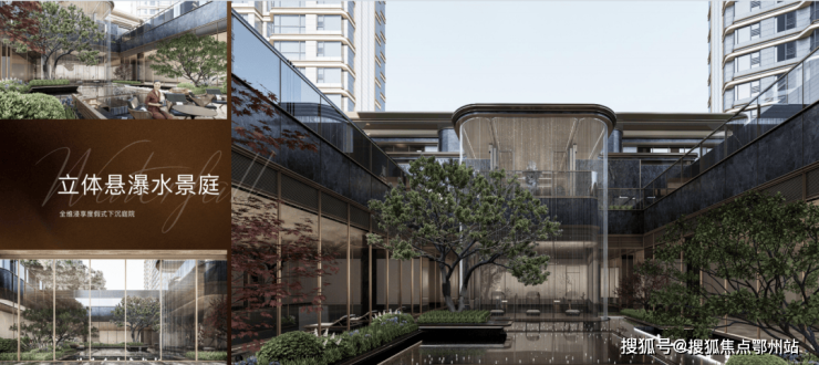 下沉式环幕庭院,跌水景观环绕,池底仿黑金砂与宝石晶片闪烁,点缀百余灯珠,师法“琉璃水光” 形意,糅合视听五感,打造全浸式立体园境,天工巧夺,嘉定未见。