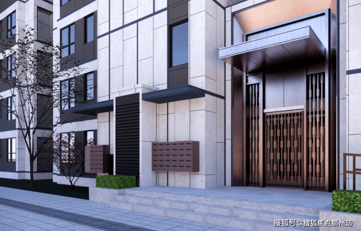 单元门头引入现代审美观念,整体两层通高,以绚丽的金属铝板搭配精致的装饰纹理格栅打造,呈现出高级的品质感,营造出充满仪式感的归家氛围。并且引入业主人脸识别、多种复合刷卡、呼叫方式出入,访客可通过门口机呼叫业主室内机授权入楼,主客进出更方便、更安全。