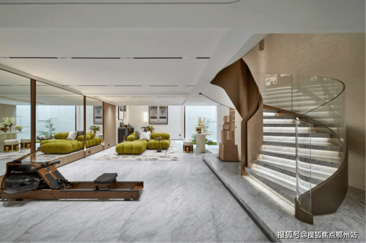 △ 滨水著品样板房客厅(上)和地下健身房