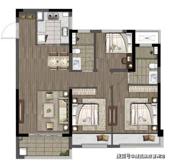 115户型,三室两厅两卫的户型设计,延伸不同家庭结构的需求。入户玄关,格局全明方正,动静分区,日常起居互不干扰,餐客一体的大进深奢阔空间,承载全家人的理想生活。 一厅双卧,三开间朝南的大尺度采光,从客厅到主次卧,都能在大飘窗或是阳台前,一揽实景园林的诗意。