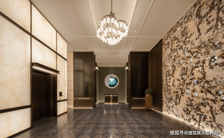 走入会所,是又一个里程碑式作品才有的震撼:范思哲黑地面指引下,迎接你的一面是“雪山银狐”石材装点墙面的电梯厅;