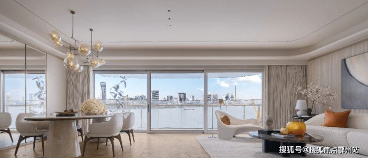 最大化消融室内外的界限, 将江景与阳光框景入室 ,尊崇感十足!客厅尺度设阔,无论是家庭生活还是高端社交,空间都能随之完成功能的转换。
