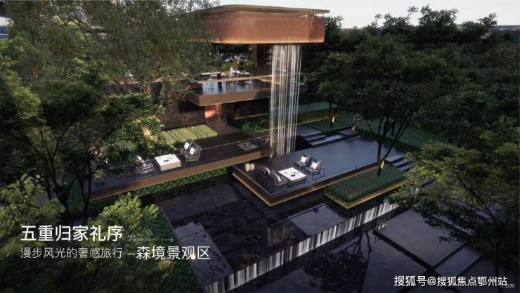 一路走过的 森系园境,皆构建于架空层之上,叠水层层流转,亭台悠然观景,颇有一份传统韵味,绿植沿地形错落蔓延,呈现台地高低层次,暗承山水溪谷之意。