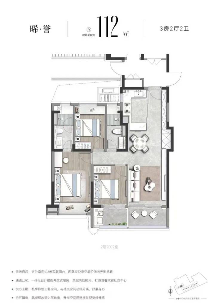 户型设计采用类一梯一户布局,开放式LDBK餐客厅一体化设计,南向大面宽带来充足采光;南主卧采用270°环幕全景舱;南次卧直连阔景阳台,满足全龄家庭需求。