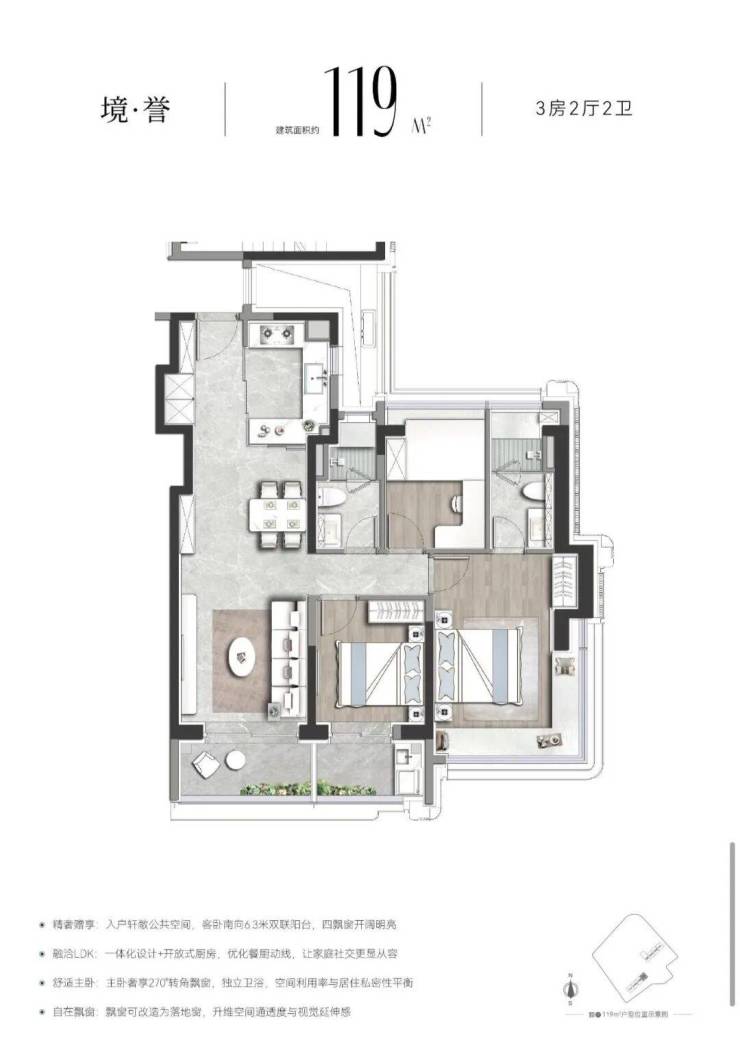 相较于市面上常见的90-100㎡紧凑三房,建面约119㎡提供了更为舒适的生活空间;而与140㎡以上大户型相比,又在总价控制上展现出明显优势。