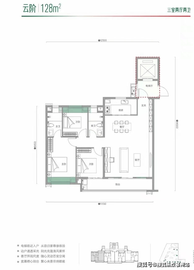 根据户型分布平面图来看,该户型所在楼栋为3梯4户格局,双连廊设计,该户型位于楼栋边户,南北通透,三开间朝南,南向有连接次卧和客厅的大阳台;户型比较方正且动静分区较好,但是过道有点浪费面积,另外根据户型图显示,该户型可以做到一梯一户的居住体验。