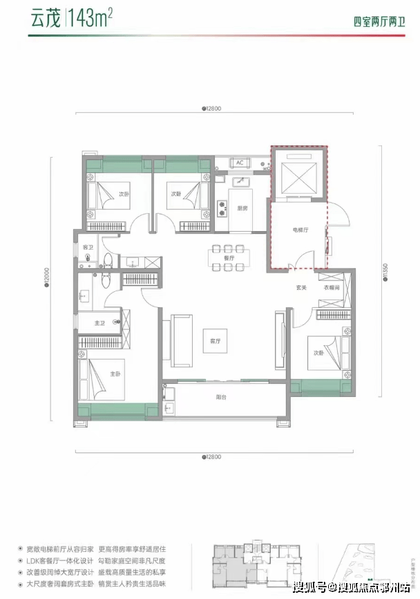 建面约143平 四房两厅两卫