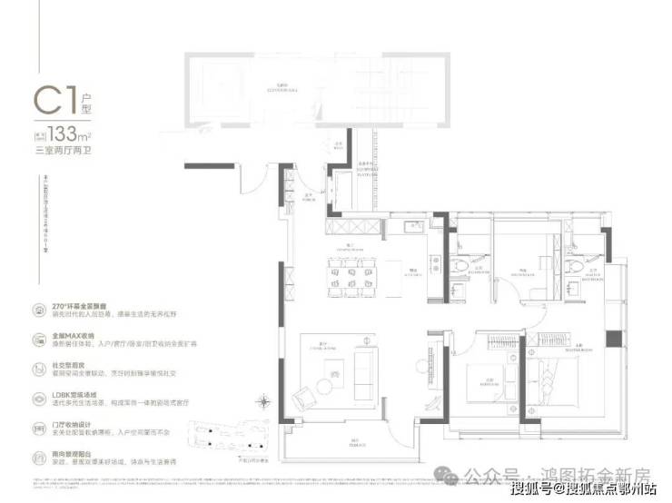 立面采用玻璃幕墙与铜色铝板,270°转角飘窗、主卧全景落地窗设计,打造极简美学地标。