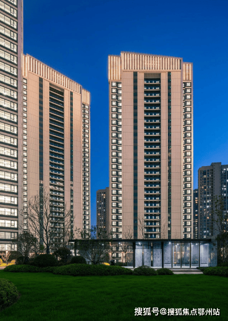 楼体公建化外立面,呈现高级的灰蓝色,与蜿蜒流淌的江水相映成趣。大面积的LOW-E玻璃,不仅提升了建筑的现代质感,还在光影变化中与周边项目形成了鲜明的视觉对比,豪宅地标感十足。