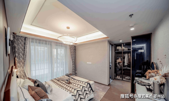 约24㎡的超大主卧套房,开间达到了约5m,配备了步入式衣帽间和南向三分离卫生间,功能齐全,尺度奢阔,堪比星级酒店的奢适享受。