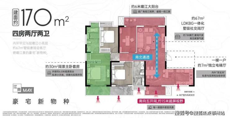 汉江·云赫把更多空间交还给生活,即便 在临江最好的景观位置也只做了16层,满足高品质改善客群对观江与舒适的双重需求。建面约170㎡超新规瞰江平墅产品设计中,则是引入“墅感大平层”理念,将别墅功能扁平化,并保留墅感尺度。 以层高3米的超前奢阔设计,1梯1户/约7㎡独立电梯厅的奢享空间,可对望城市地标的约6米瞰江大阳台,可兼容社交、赏景、待客、宴饮的LDKBG一体社交阔厅……在从容的转圜中实现平层向平墅的迭代,在多元场景交融中重塑武汉改善客群对人居舒适高度的标准。