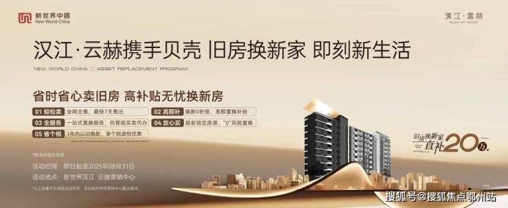 19号楼16F江景楼王,建面约170㎡超新规瞰江平墅,换新直补20万起!即日起至2025年8月31日,汉江·云赫“以旧换新”资产置换计划同期启幕,5重置换权益,一站式置换服务,让您轻松卖,放心买,即刻换新家!