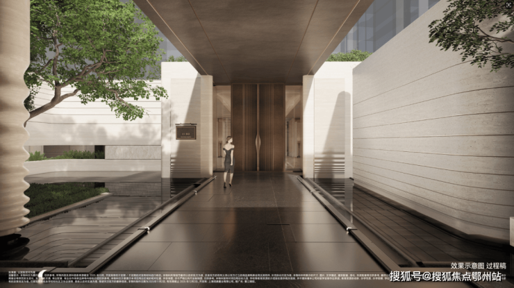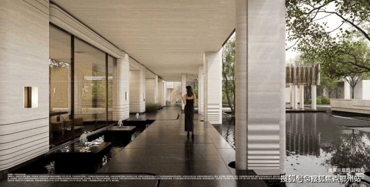 伴水归家,羽毛枫四时变幻的叶色,提醒每一位归家者:踏入此门,便是告别喧嚣,回归内心的静谧与从容。约5米宽的流光回廊,打造无风雨归家体系,以香槟铝板为顶、辅以黄金比例柱列,涌泉水钵,展现了【水】的不同表现形式。