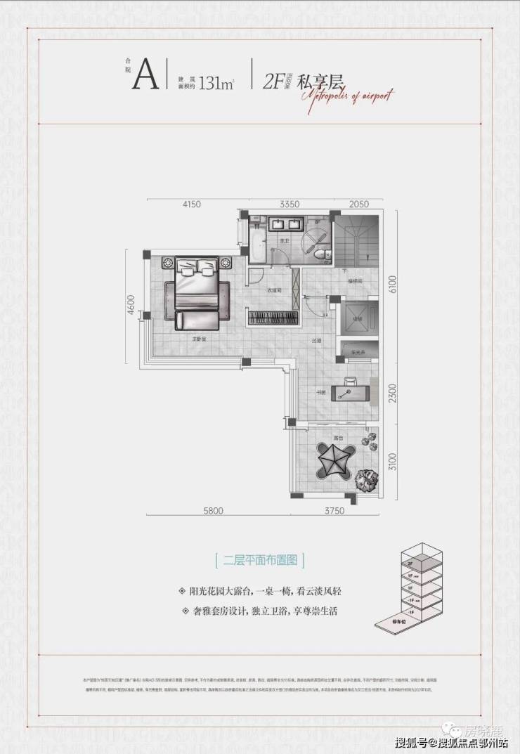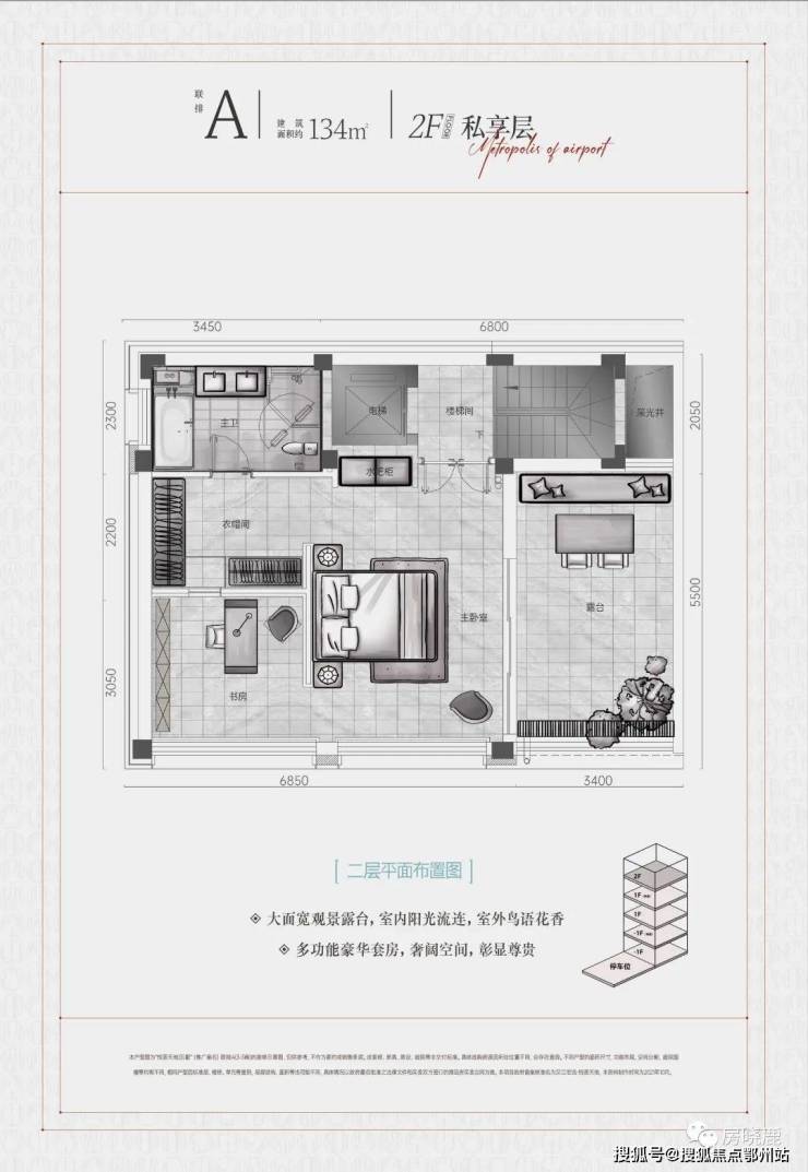 2F“私享层”实际为地上第3层,设计为主卧+衣帽间+卫浴+书房+露台的奢侈大套房。