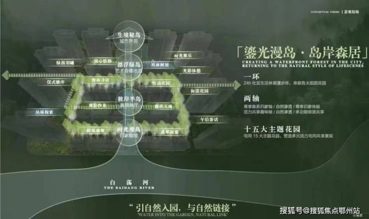 以“山水聚场”理念,规划“一环两轴十五园”景观布局 ,将水岸、岛屿、森林、花园、树屋作为园林节点,形成“行在景中、坐在岛中、游在林中、意在境中”的美学表达,营造出沉浸式山水活力场域。