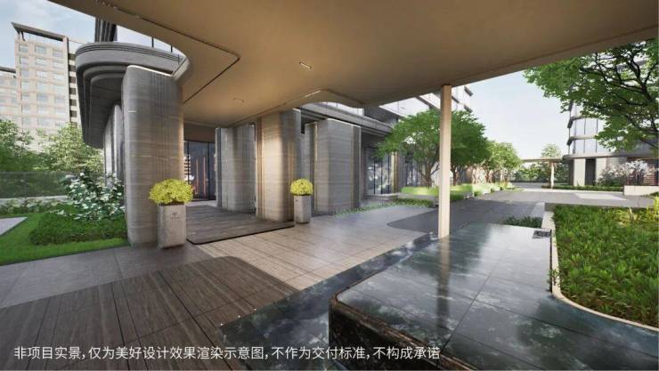 主题架空层 与景观一体化设计,在功能、空间、形态上形成互动与互补,内部空间与外部景观良好融合; 全域风雨连廊 ,功能上实现无风雨归家及游园,视线上随着脚步,沿途移步异景,当你归家时犹如穿越绿洲的旅行。(报建为景观廊架,后期存在改造的可能,以实际交付为准)