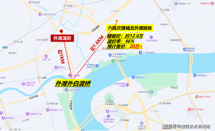 今年六批次土拍,绿城竞得北外滩新宅地,溢价率超过46%,未来售价预计突破20万元,它的位置就在「外滩瑞府」东侧约1KM。