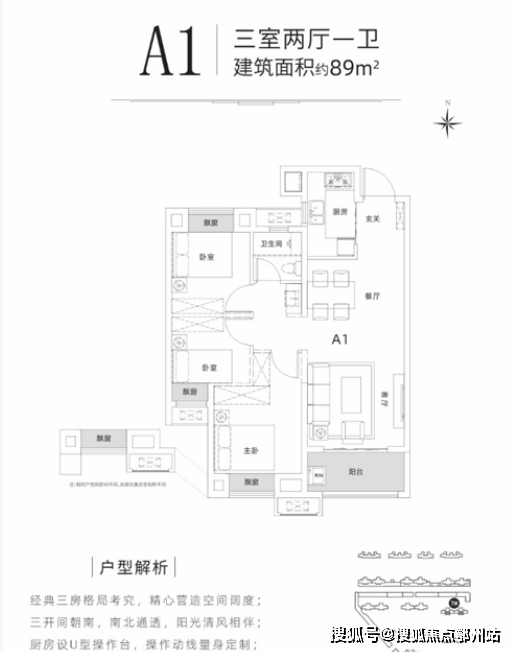 ① A1户型 89㎡、3室2厅1卫
