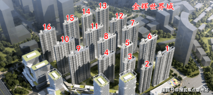 金辉世界城住宅占地面积约9.7万方,总建面约57.8万方,容积率约4.5,共4297户,机动车停车位5055个,车位比约1:1.2,共16栋住宅,2所幼儿园和部分社区底商。