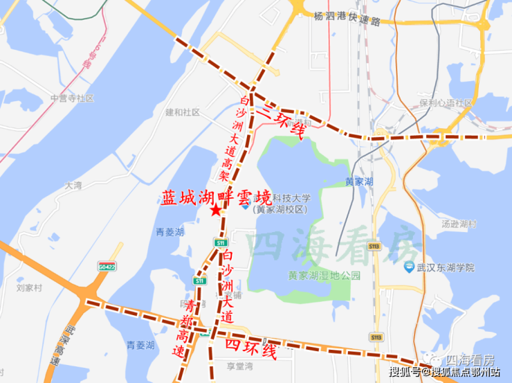该板块夹在青菱湖和黄家湖之间,白沙洲大道高架通过,北接三环线,南面连通青郑高速直达咸宁,周边为大学城,生活配套、交通出行都比较成熟,烟火气十足。