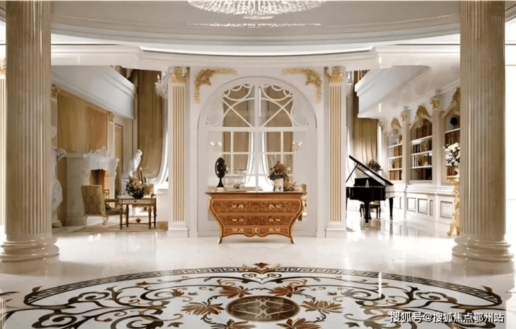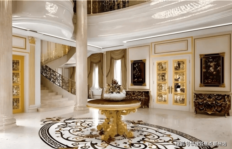 入户门厅比普通豪宅的客厅还要大,客厅的 两根罗马立柱让这个空间满满都是仪式感。