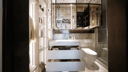 顶柜上方一面镜子,能让你清楚知道柜子里有无遗漏物品;卫生间台盆下方,特意为扫地机预留了空间;针对高处拿取物品难题,特意配置了下拉柜;针对转角深处取物,配置了转角联动抽拉组件……