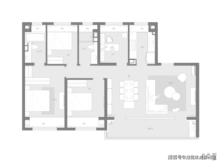 厨房、餐厅、客厅、阳台都能彻底连通,不仅南北通透,全屋空气对流,更带有开阔横厅,直通景观大阳台,堪称一绝,邀请三五好友来开派对,毫无问题。