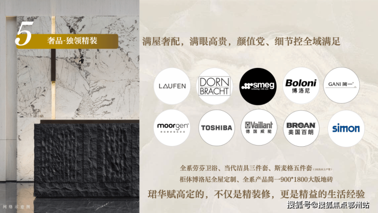 荟萃斯麦格、劳芬、当代、博洛尼……等进口国际奢装品牌,细节考究,入户智能门锁+全屋WIFI,全屋智能化控制面板等智奢标配,只为更质感人居。