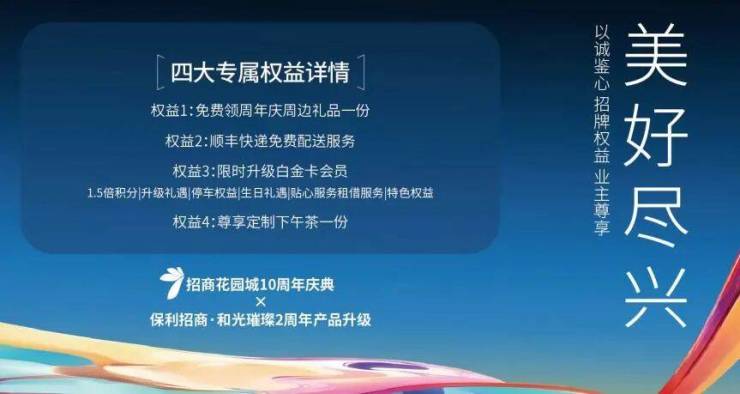 作为保利发展与招商蛇口双央企联袂打造的高端人居作品,和光璀璨自面市以来,始终以“品质”为核心,如今项目于招商·花园城10周年之际,联袂为业主的品质生活更添砝码。已领取花园城10周年纪念卡的业主,可于10月31日-11月2日至昆山花园城3号门(星巴克旁),享四大权益: